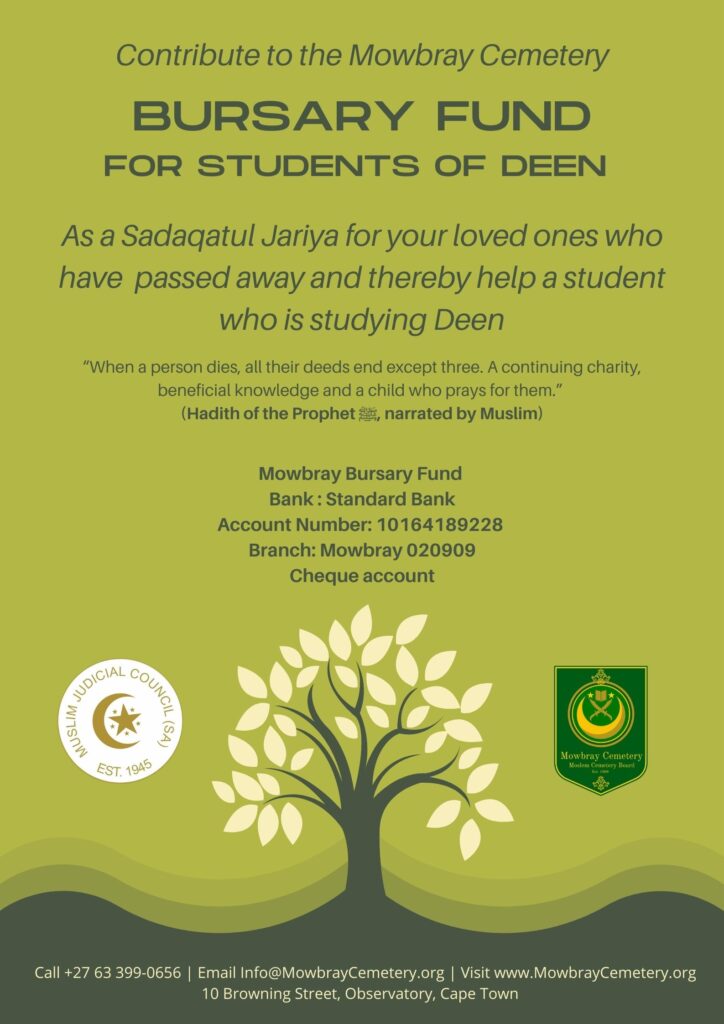 The Mowbray Cemetery Bursary Fund was initiated by the Board Chairman Faizal Sayed and Inspired by Shaykh Riad Fataar of the MJC. History has it that Shaykh Fataar had made numerous requests for such discussion knowing the challenges students of Deen face. The Moslem Cemetery Board eventually launched the Mowbray Cemetery Bursary Fund for Students of Deen.